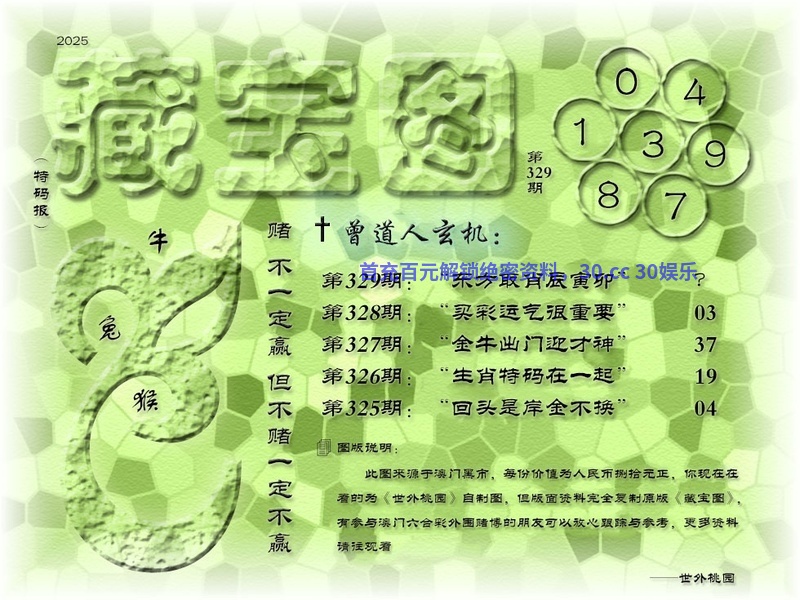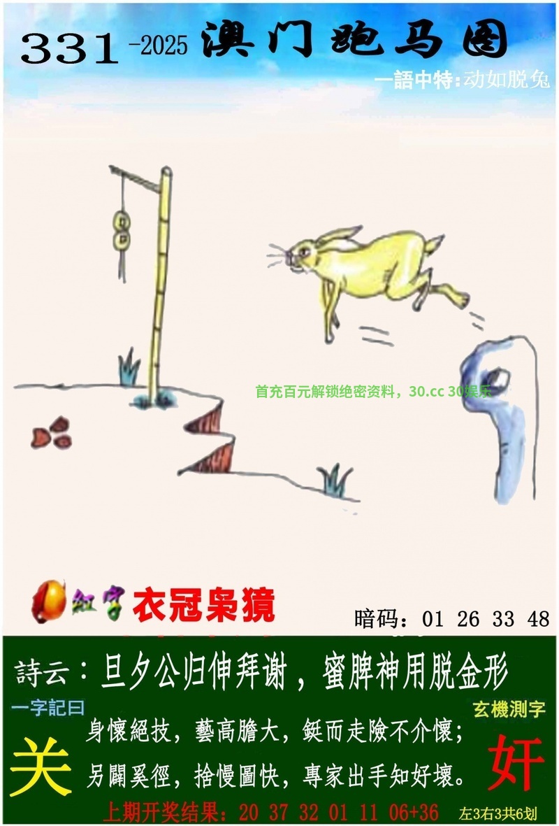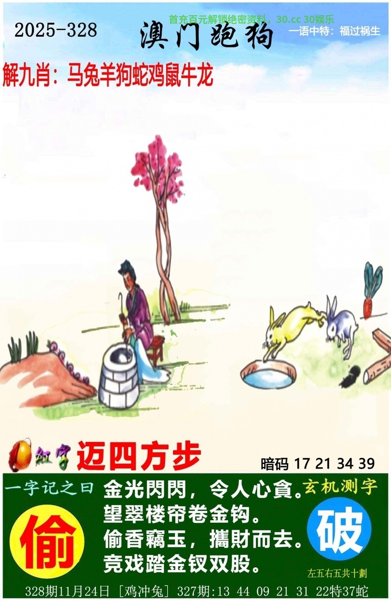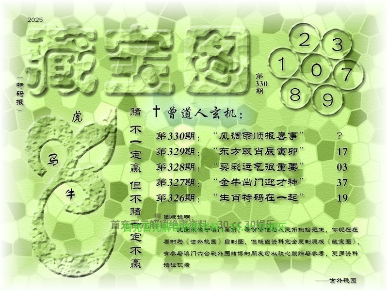 | 330期:风调雨顺报喜事 解释:风调雨顺报喜事,解吉肖羊兔蛇鸡龙马 藏宝九肖:羊兔蛇鸡龙马虎狗牛 藏宝⑩码:11.23.03.13.21.02.36.28.32.05 |