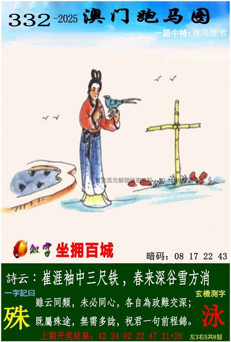 | 333期:蓝天白云鸟儿飞 解释:蓝天白云鸟儿飞,蓝天解天肖猪猴兔龙牛马 藏宝九肖:猪猴兔龙牛马鸡鼠狗 藏宝⑩码:31.43.22.03.26.05.36.21.06.32 |